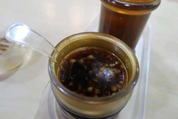 蒜头酱的做法也很简单,将香醋、生抽、食盐等调和后没入蒜蓉,再加上福州人喜闻乐见的砂糖甜,一份蒜头酱就上桌了。