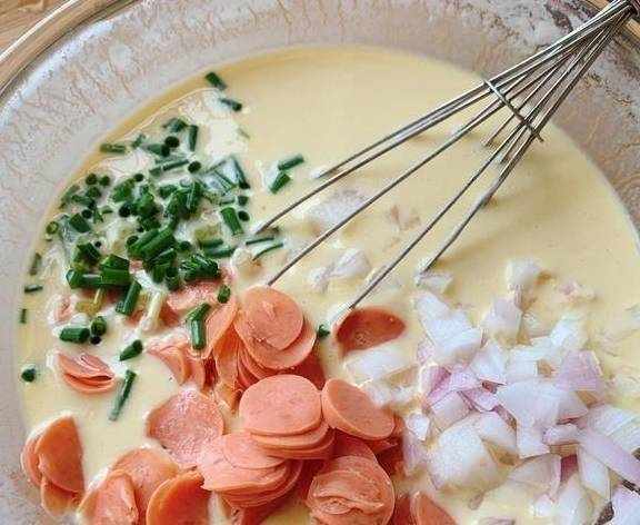 另外也可以用最近比较火的切菜神器,1分钟就能切好,更适合早上用,毕竟早上的时间特别宝贵,你说是不是?第二步:面粉倒入盆中,打上两个鸡蛋,然后把切好的洋葱丁和火腿肠丁一块放进去,随后放入适量的食盐、芝麻,最后慢慢地加水,边加水边搅拌,搅至均匀的面糊状就行。