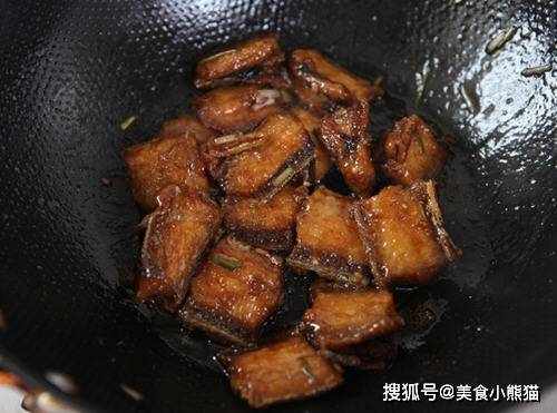 7、倒入炸好的带鱼,翻炒至裹满酱色。
