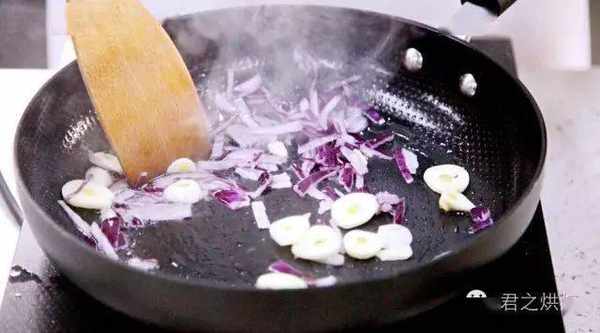 锅烧热,倒入橄榄油。将洋葱末和切片的大蒜倒入锅中翻炒1分钟,炒出香味。