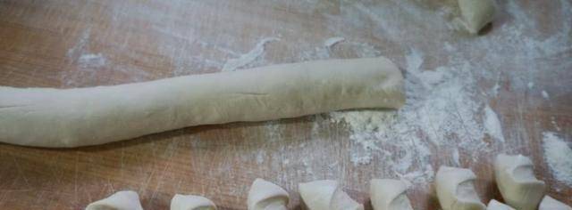 然后,从这一刻起,你就可以包饺子了。拿面团揉好,然后给她剪匀的长条饺子皮,铺在边薄中间厚的饺子皮上。