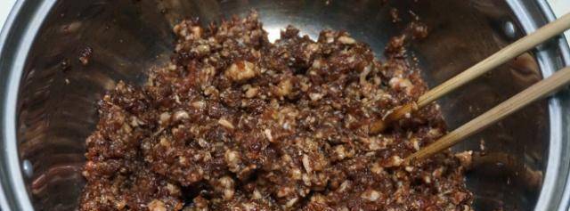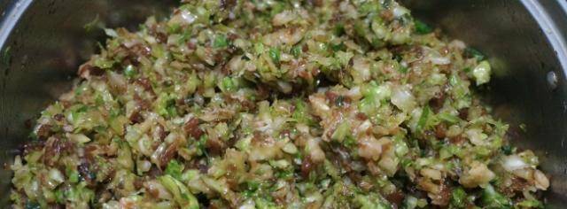 然后我们把葱、姜和这个油晒干,放入肉馅里搅拌均匀,然后加入我们捏好的菜汁白菜,顺着一个方向搅拌。