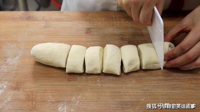1个小时以后面团已经发酵好了,扒开面团看一下,里面有许多蜂窝眼,说明面团发酵的不错。随后在案板上撒一点面粉,取出面团后先揉一会,把面团揉光滑把里面的小孔搓实。之后把面团搓成稍微粗一点条,再切成一个一个等分的小剂子。
