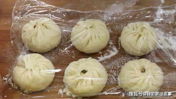 按着这个方法,把全部的馅料和面皮包完以后,摆放在案板上面,两个包子之间留点空隙,盖上保鲜膜再把包子醒发20分钟。
