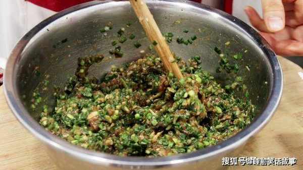 韭菜切成粒,大葱白先切成粒再剁碎,生姜一小块剁碎后和葱、韭菜放在一起。倒入一点植物油搅拌开,这样韭菜就不容易出水。