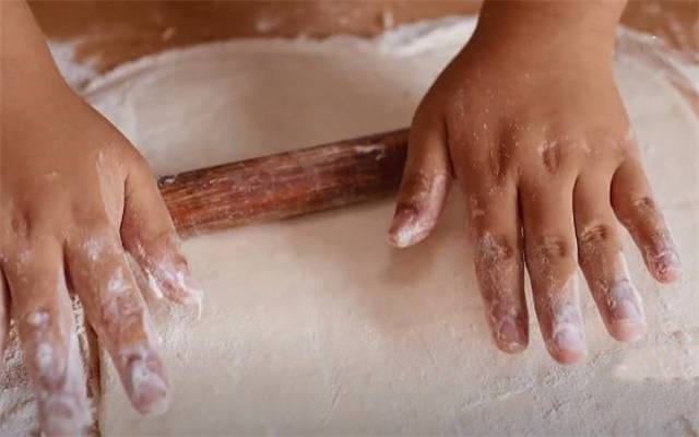 7.把小尾巴藏在下面按扁,再用擀面杖擀开。