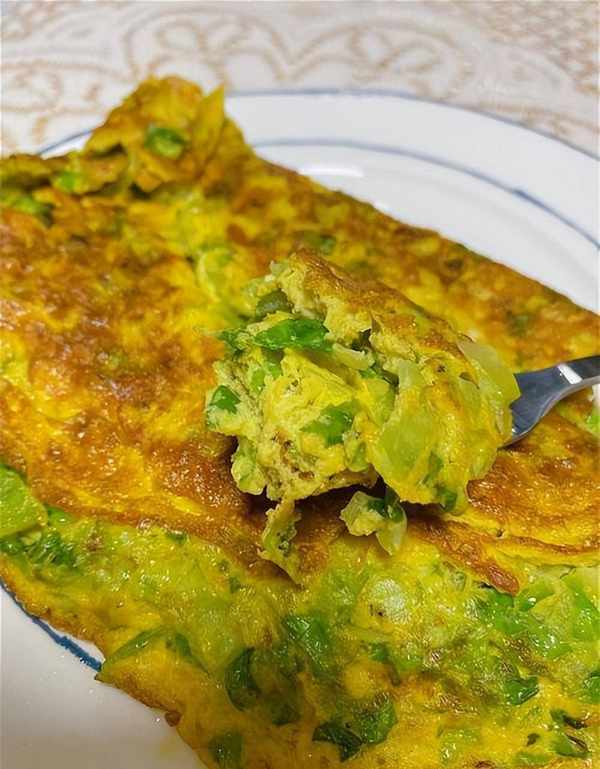 然后用铲子将鸡蛋液和生菜倒入锅中,煎至两面金黄即可。
