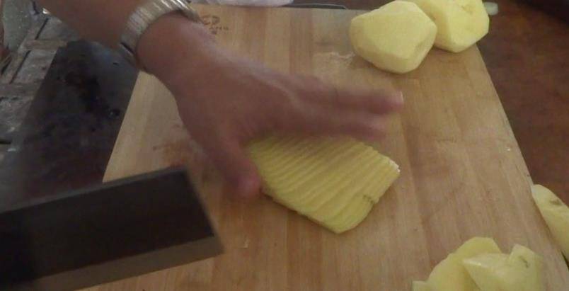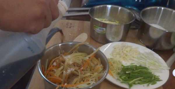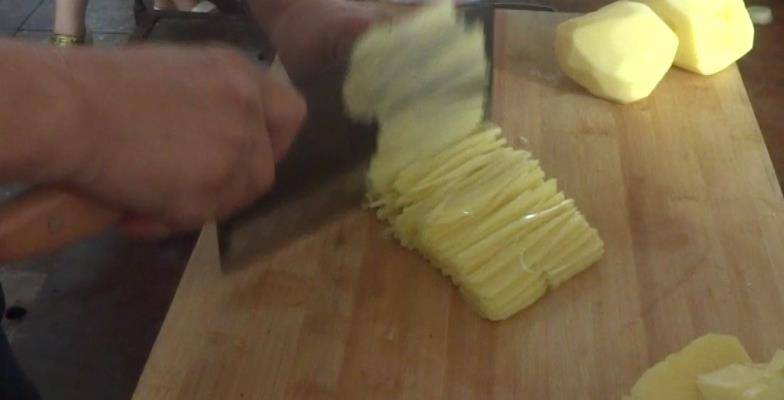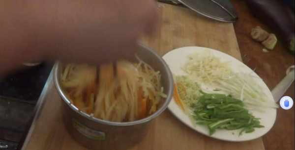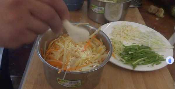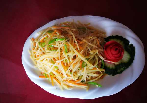 1.将土豆削皮,切一平面放稳,切2~3毫米的薄片,放倒排成瓦楞状,直刀切2~3毫米直径的丝,放水盆中浸泡,胡萝卜切丝浸泡。