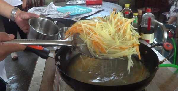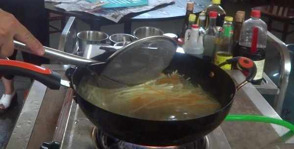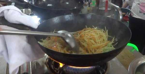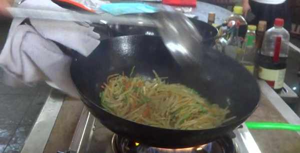 5.放入控水的土豆、胡萝卜丝,搅拌均匀受热,在土豆丝加热至刚由灰白色变为半透明的暗青白色时,约七成熟不等开锅即迅速捞出。土豆丝也可直接下锅煸炒成熟,但口感略显绵软。