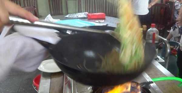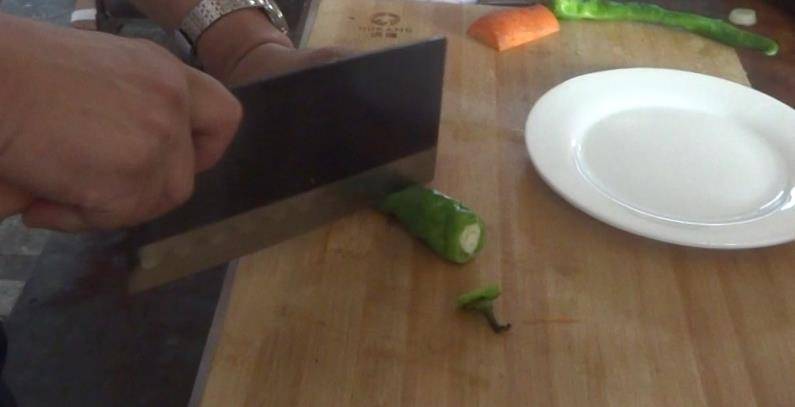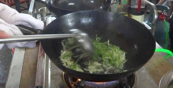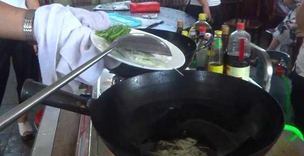 7.锅中放入适量花椒油热后,放入葱蒜煸炒至发黄,再放入姜末、尖椒丝煸炒出香味。葱蒜煸黄才能把辛辣的硫化物,转化成稳定的脂溶性香味物质。姜受热过度,会使蛋白质的鲜味成分破坏损失。