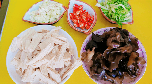 【准备的食材】:黄瓜,腐竹,木耳,小米辣,香菜段,花生米,大蒜。