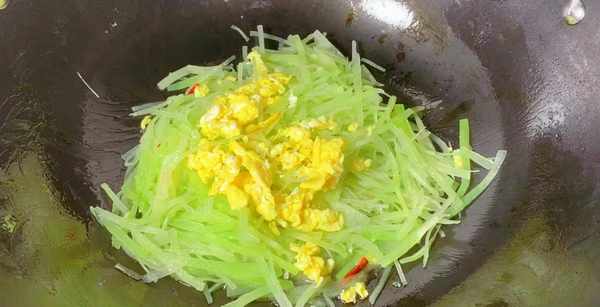 2、先起锅烧油,把碗内打入的鸡蛋液炒碎盛出,再起锅放入2个蒜瓣炒香,把焯水的莴笋丝倒入锅内,大火快速翻炒、放入少许的香醋和少许的蚝油、盐调味,把鸡蛋碎和小米辣倒入后关火,翻拌一下盛出来即可。切记不要炒过火,快速翻炒两下即可,不然莴笋影响口感。