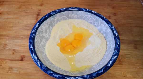 先在碗中放入200克的玉米面,200克的面粉,接着打入两颗鸡蛋,根据自己的口味加入适量的白糖,四克酵母搅拌均匀,因为鸡蛋大小各有不同,所以里面的水分也要适量增减,给它搅拌均匀(我放的是细玉米面,所以不用开水烫,如果家里没有的,需要放粗玉米面的朋友,最好用开水给它烫一下,然后晾至微凉以后再加入面粉和鸡蛋酵母揉成面团)