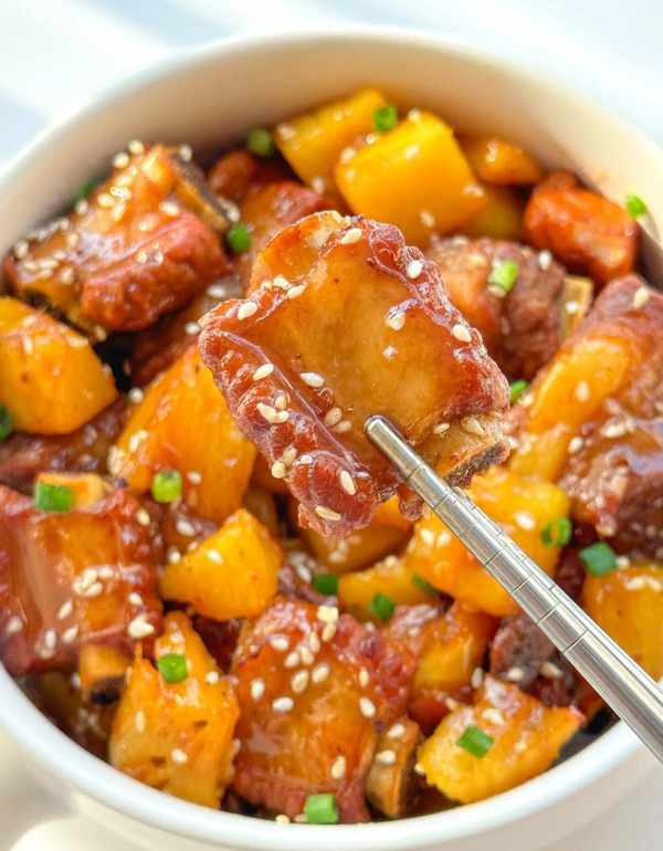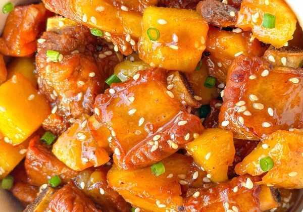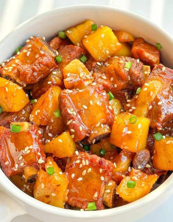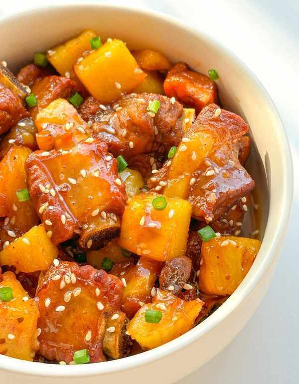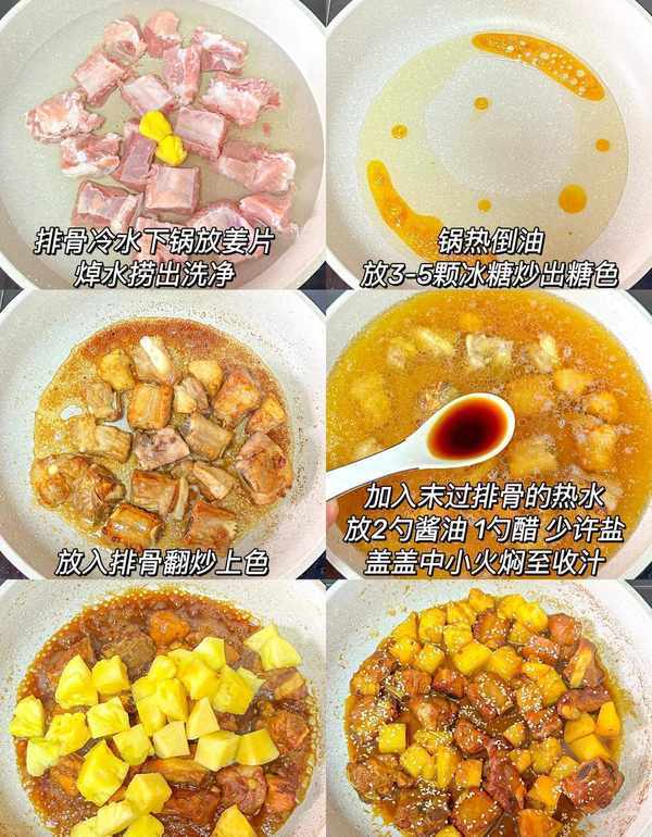 主要食材:排骨,菠萝,白芝麻,姜片,生抽,醋,盐,冰糖,葱花,糖醋酸甜解馋,但是工序太复杂了,一般人没这个耐心和时间,退而求其次就可以学这道菠萝排骨,解馋程度不输糖醋排骨,更是多了一层水果独有的清香。
