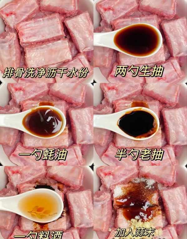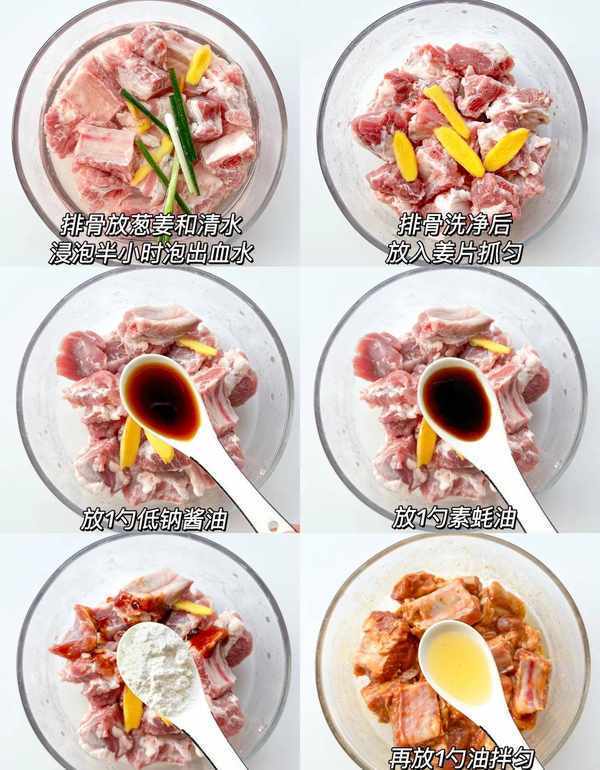 1、排骨先在水龙头里冲洗几次后沥干水分,加入2生抽,1勺蚝油,半勺老抽,1勺料酒,蒜末盐和白糖按照自己的口味增减,再来少许的黑胡椒粉,2-3勺玉米淀粉,搅拌抓匀腌制60分钟以上。