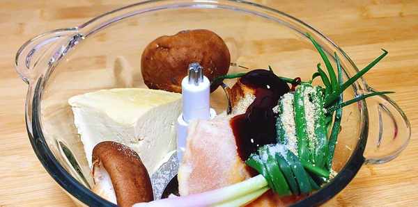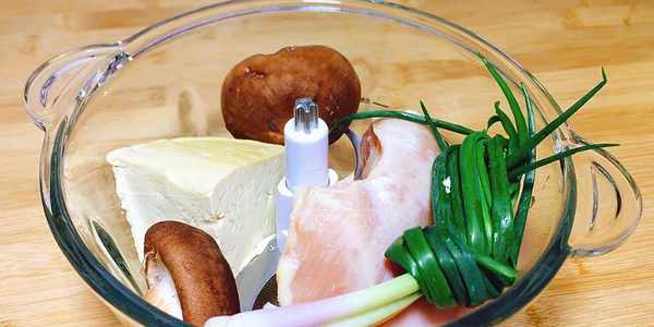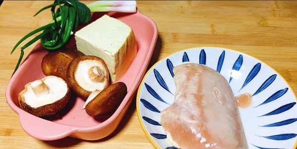 一: 食材准备:鸡胸肉一块,香菇两朵,老豆腐一小块,小葱三根