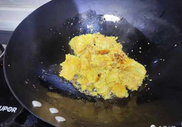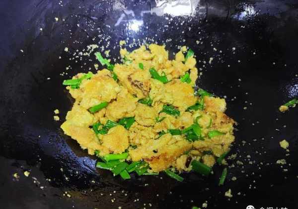 5.炒均匀之后再倒入备好的蒜苗叶子,蒜苗叶子可以增加这一道食材的颜色,有黄有绿,看起来更加诱人。然后用蚕丝将它们炒均匀,调味一下。将锅里面的蒜苗叶子炒至颜色翠绿好看之后,我们就可以关火出锅了。