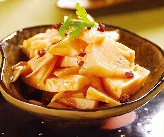 1.炒锅内放油烧至七成热,下冬笋块、花椒煸炒 30 秒钟,再下酱油、盐炒几下,加入骨汤,加味精焖 2 分钟,收干汤汁,盛入盘中。