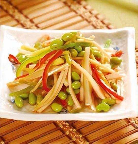 1.茭白去壳,削皮,切去老根,切成丝;青、红椒去蒂、子,洗净,切成丝;毛豆洗净,用清水煮 5 分钟,捞出过凉。