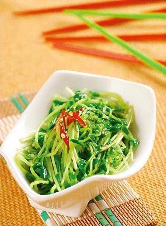 2.油锅烧热,煸香干红辣椒丝、蒜泥、姜末、葱花,加豌豆苗煸炒,再加料酒、盐、白糖、酱油、醋,炒至断生,加香油调味即可。