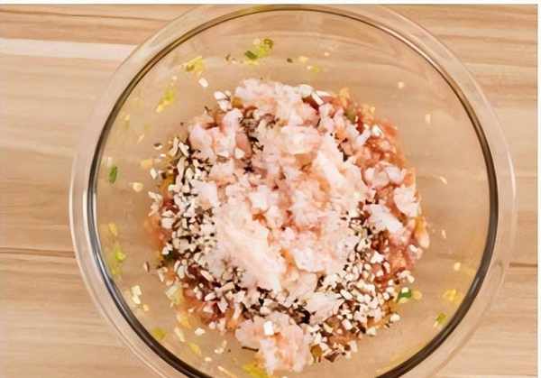 2.碗中倒入肉糜,打入鸡蛋,加入葱末、姜末,调入盐、生抽和老抽,顺着一个方向搅拌上劲。倒入虾糜、香菇末,顺着同一方向搅拌均匀。