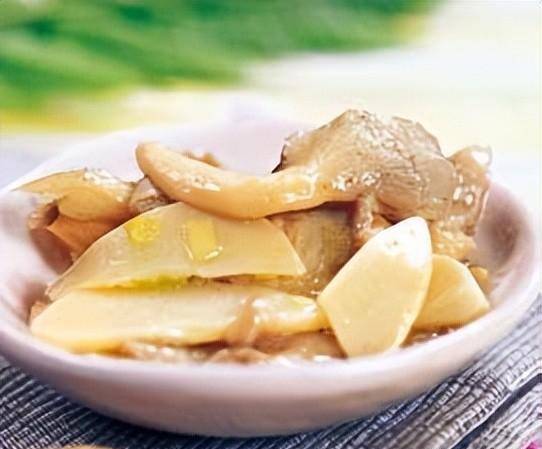 1.冬笋用清水稍泡,洗净,切成小块,放入沸水中焯一下,捞出,再放入凉水中浸凉,捞出沥干;鲜蘑菇洗净,放入沸水中焯一下,捞出沥干,切两半,备用。