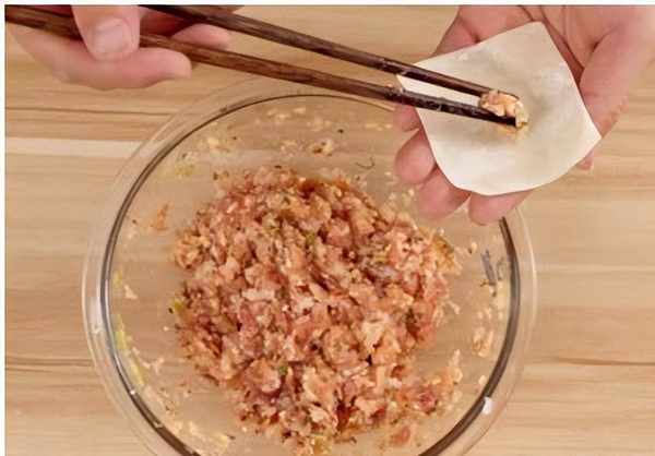 3.抄手皮平摊在手中,一个角对着掌心,中间放入肉馅,对折成三角形(上方的面皮短一点,下方的长一点)。