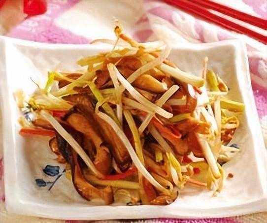 2.锅内倒植物油烧热,爆香蒜末、姜丝、干红辣椒丝,放入香菇丝、韭黄段、绿豆芽,大火快炒,倒入料汁翻炒至熟,淋上香油即可。