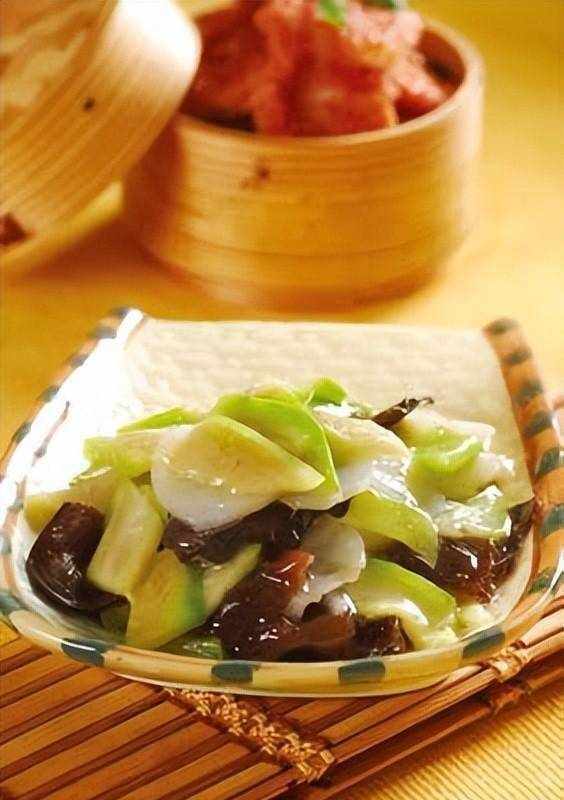 3.下丝瓜片翻炒,再放入荸荠片和黑木耳翻炒至熟,加盐调味即可。