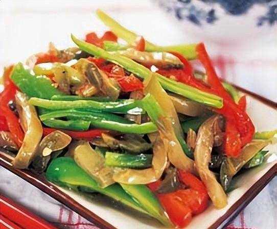 1.榨菜洗净,泡水后切丝,沥水;青、红椒洗净,去蒂、子,切丝。