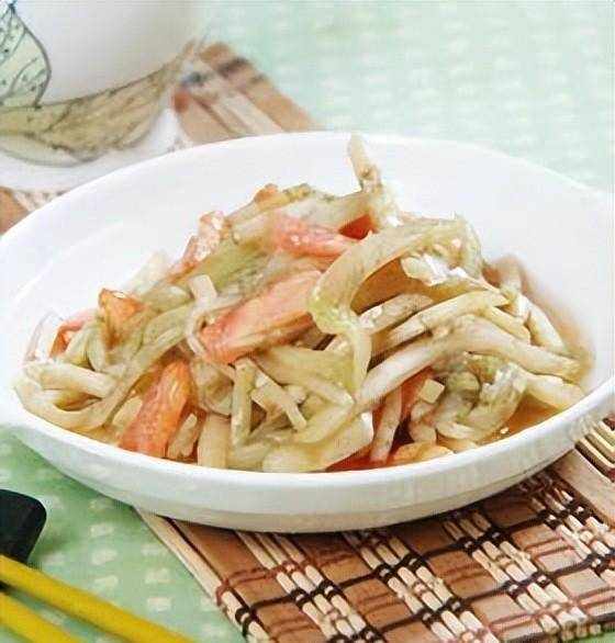 1.茄子洗净,去皮,切粗丝;番茄洗净,切粗条。