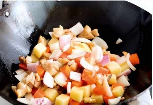 3.另起锅,倒入食用油烧热,下入鸡肉丁翻炒至变白,下入土豆、胡萝卜、洋葱,翻炒均匀。