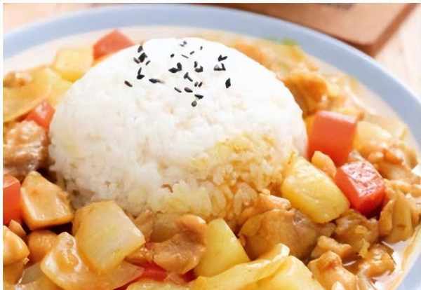 5.煮好的咖喱鸡肉浇在米饭上,撒入少许熟黑芝麻,可点缀上西蓝花。