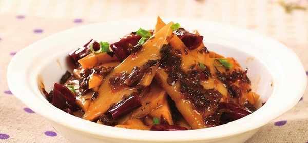 做法 1 春笋去壳,取嫩的部分,斜切成厚片,入沸水中汆烫 5 分钟,捞出沥干。梅干菜泡透,挤干水分切碎。干辣椒掰段。