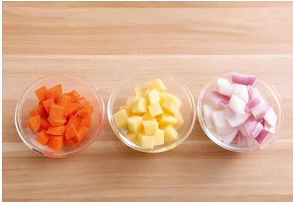 1.土豆、胡萝卜去皮洗净切丁;洋葱洗净去皮,切片;西蓝花洗净,焯熟备用。