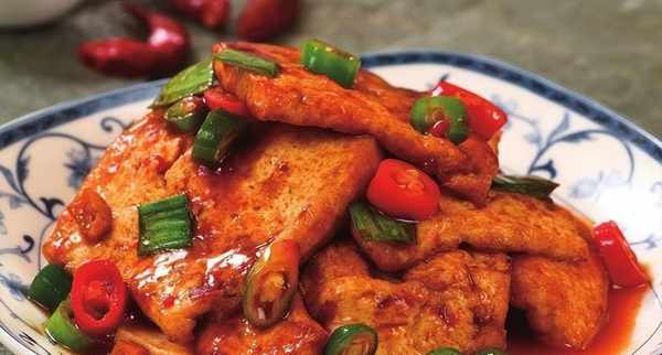 3 锅洗净,加油烧热,下葱段、姜片炝锅,入杭椒、红尖椒干煸一下,放入豆腐片炒匀,加少许高汤、盐、鸡精、老抽,烧至水分快干,放入青蒜,翻炒出锅。
