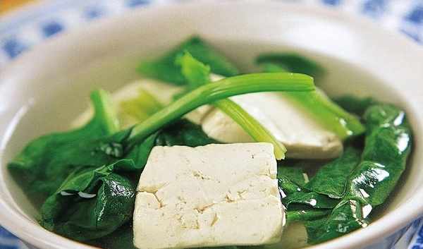 2 油锅烧热,下葱末、姜末炝锅,倒入高汤,放入豆腐,加料酒、盐、味精,再放入菠菜烧沸,出锅时淋少许烧热的色拉油即可。