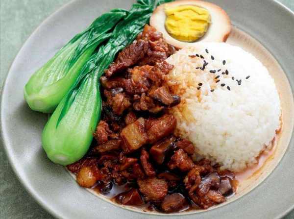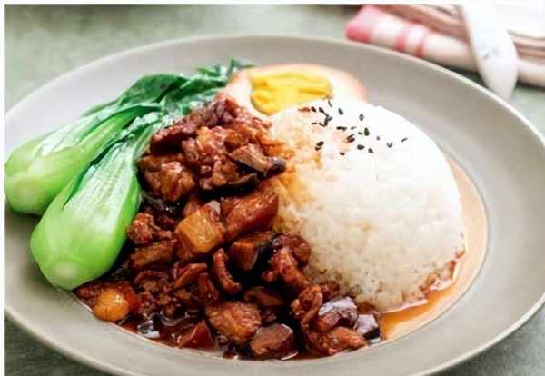 6.米饭装盘,撒上少许熟黑芝麻,舀上卤肉,配上青菜、鸡蛋即可。