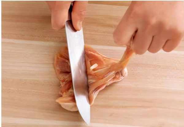 2.鸡腿洗净,划一刀,沿着鸡骨切开,将鸡骨从鸡腿肉中剥离。鸡腿肉切丁,调入盐、生抽、料酒,搅拌均匀,腌渍 30 分钟。
