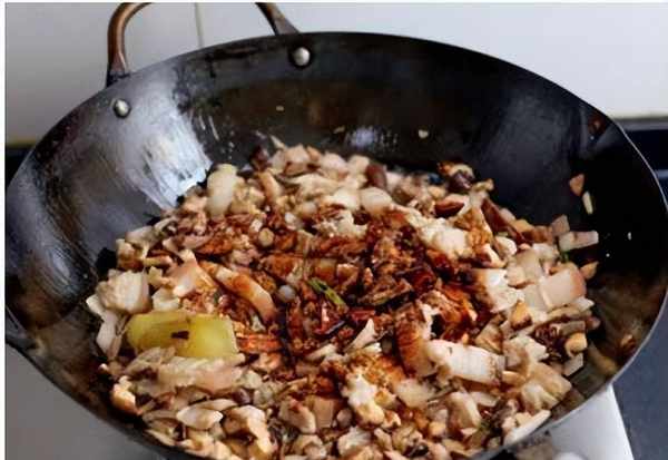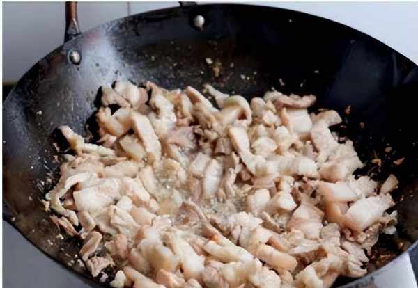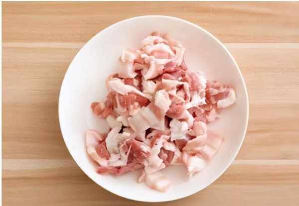 2.锅烧热(无水无油),下入五花肉,中火煸炒出猪油,捞出肉丁备用。