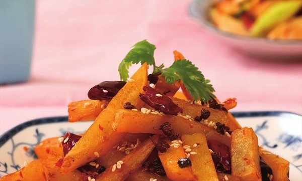 2 锅留底油,放入干辣椒、花椒、蒜蓉小火煸香,放入土豆条炒匀,加盐、味精拌匀,撒上炒熟的白芝麻、葱花即可。