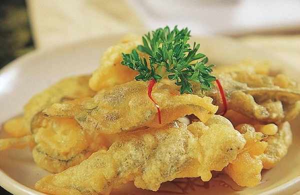 3 炒锅里放入油,烧至五六成热时,把沾好面粉的香椿芽再沾上鸡蛋面糊,放入油锅中炸制,待面糊一熟,即可捞出香椿鱼,控净油,蘸花椒盐食用。