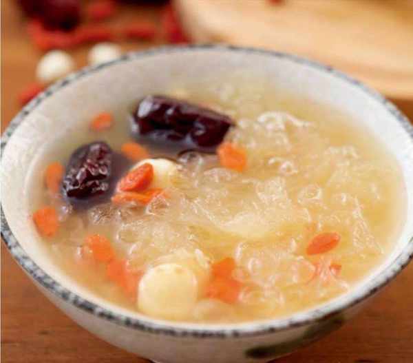鲜银耳半朵|莲子、红枣各 10 克|枸杞子少许