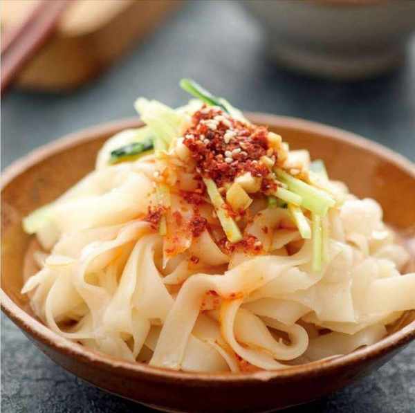 4.取出面皮切成一指宽的细条。取适量凉皮放入碗中,放入黄瓜丝、花生碎、生抽、盐、香油、香醋、辣椒油、蒜末拌匀即可。
