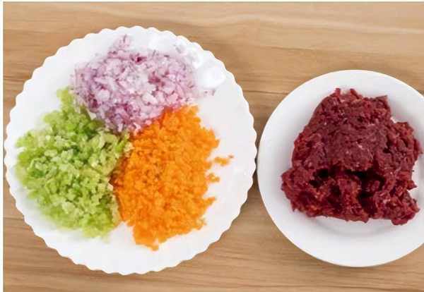 1.芹菜择去菜叶,洗净切细末;胡萝卜、洋葱洗净切细末,留少许洋葱切丝;牛后腿肉洗净剁成肉末;番茄去皮,放入破壁机中,加少许水,点动搅拌成番茄汁。