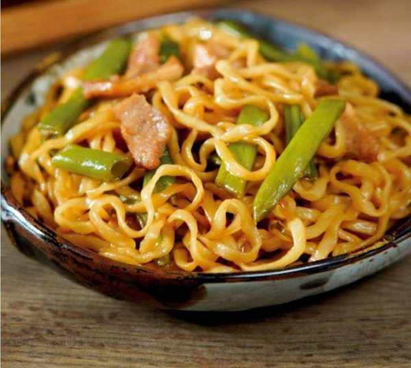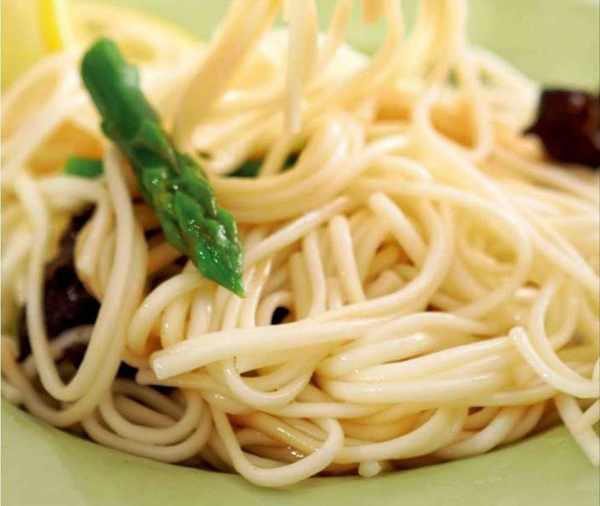5.将海参和芦笋捞出沥干,放在面条上,淋上一层鲍鱼汁,拌匀后即可食用。