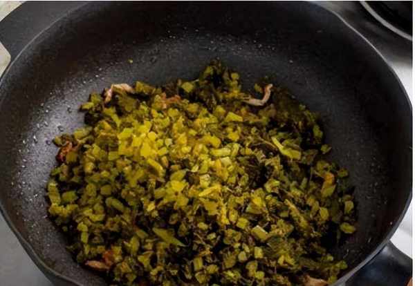 3.雪菜去掉根部,切碎后下入锅中,调入盐,加入少许水,继续翻炒 3 分钟左右,盛出装盘。