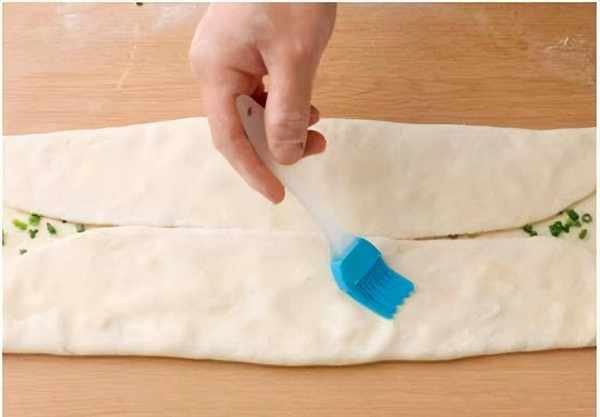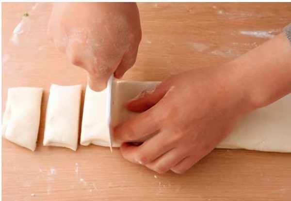 4.将面皮的长边向中间对折,刷上香油,再对折,切成长约 5 厘米、宽约 3 厘米的面剂子。