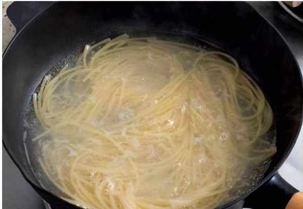 4.另起锅,倒入适量水烧开,下入意面,煮约 8 分钟后捞出沥干。