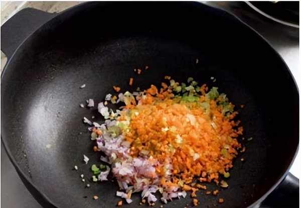 2.锅中放入黄油,中小火加热至熔化,下入洋葱末、胡萝卜末、芹菜末,翻炒出香味,盛出备用。